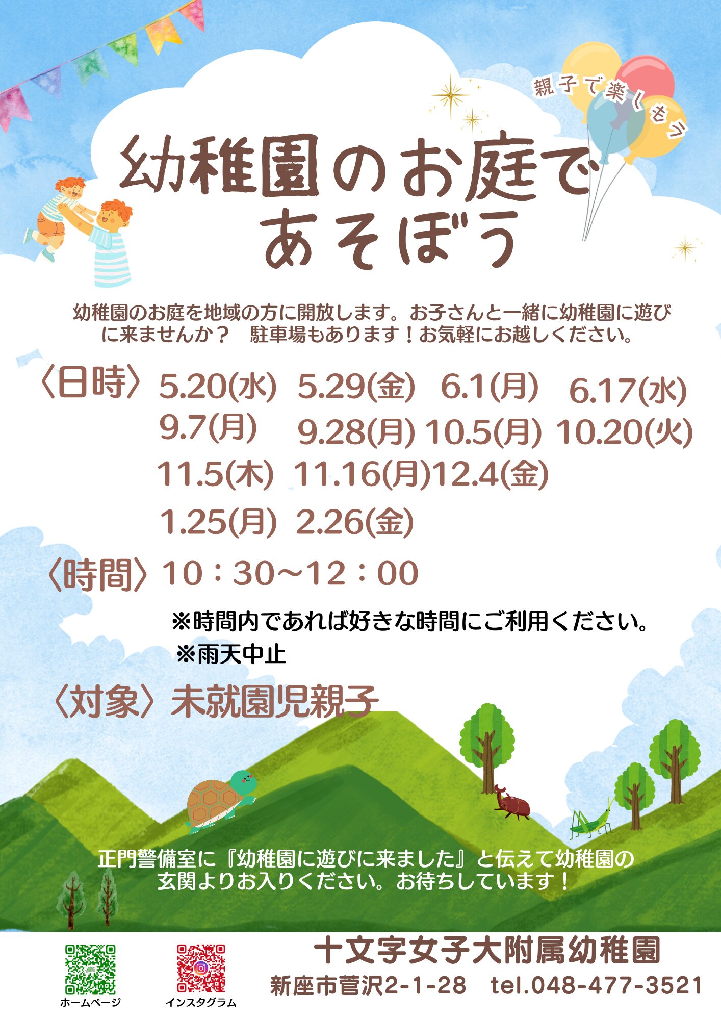 幼稚園のお庭で遊んでいただけるよう、未就園児のお子さんのため、園庭を開放しています。 令和7年度2・3学期の実施予定日は以下の日程となります。
