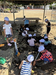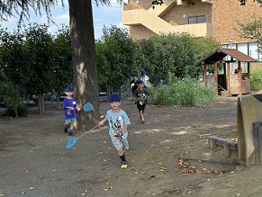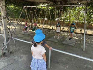 さて、次の日です。登園するとすぐに、園庭に飛び出して行きます。帽子をかぶって、日陰を選んで遊ぶようにします。