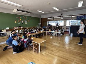 後ろの方に座っている年長さんの背中が大きく見えます。