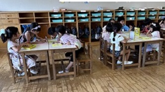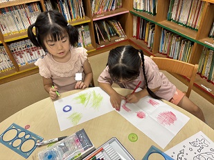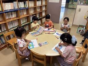 【朝きりん組】の様子です。図書室で絵本を読んだり、お絵描きをしたり、折り紙をしたり、自分の好きなことをして過ごしています。