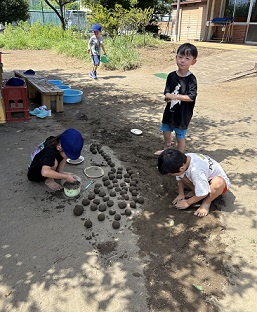 暑い日には、裸足でお水が一番。お団子もたくさんできました。