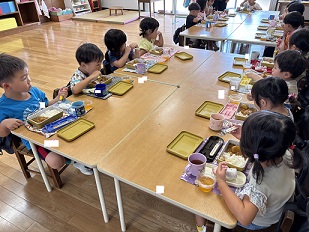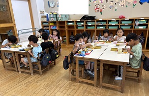 あお組は、一足先に話し合いを済ませて、新しいグループで給食がを食べています。