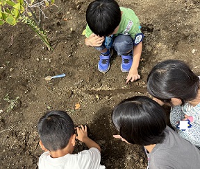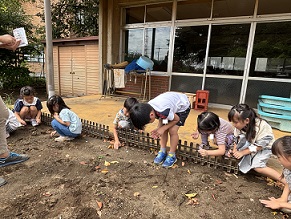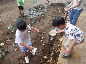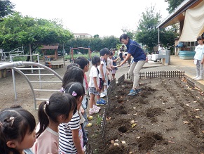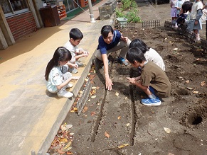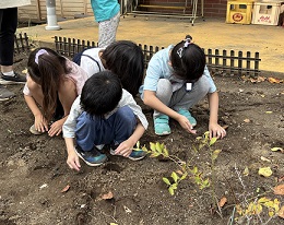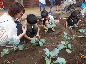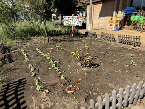 9/19(金)防災訓練の後、年長さんが畑仕事をしました。子ども達と秋に育てる野菜について考えてました。育てる野菜は、ダイコン、ニンジン、ラディッシュ、ブロッコリーの4種類です。