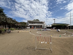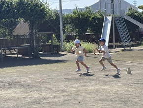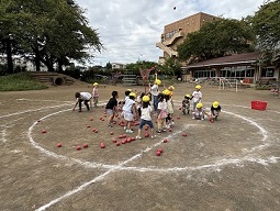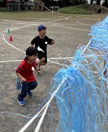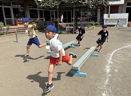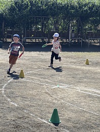 まだまだ暑い日が続いていますが、子ども達の気分は運動会に向いてきているようです。朝から、2チームに分かれてリレーが始まりました。あお組から始まったリレーですが、気が付くとしろ組も仲間に入って、あお・しろ混合チームができていました。