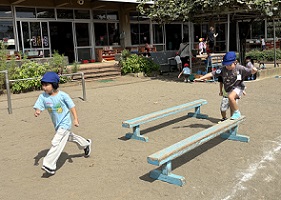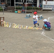 先週の月曜日から、年長さんが障害物競走の練習を始めました。とは言っても、みんな揃って練習するのではなく、自分たちで準備して、やりたい子からやってみようというもの。