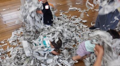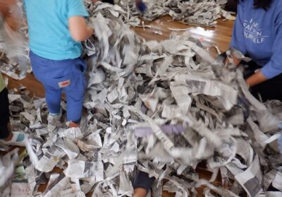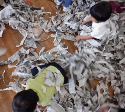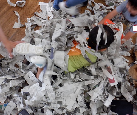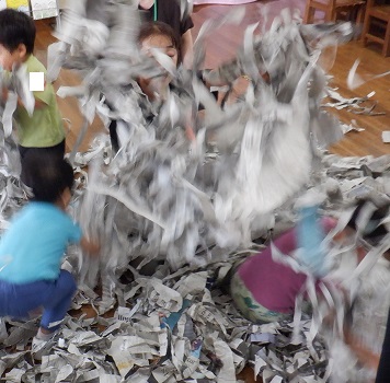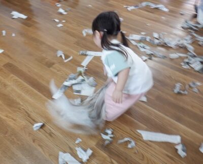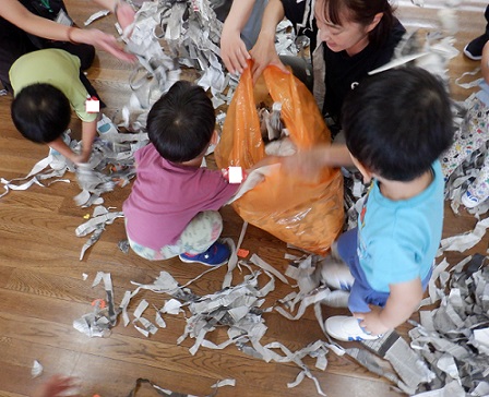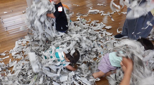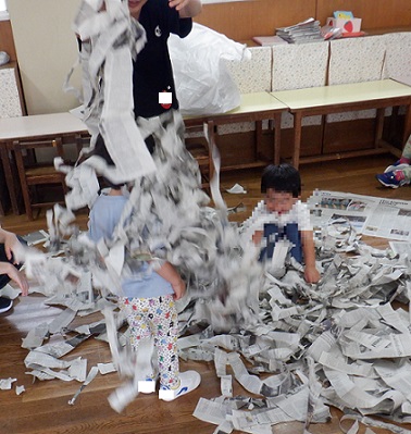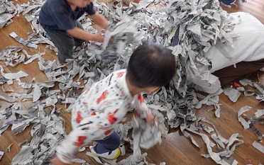新聞ちぎりが始まり、みんなでビリビリ♪