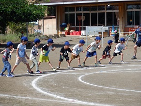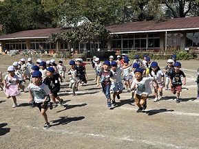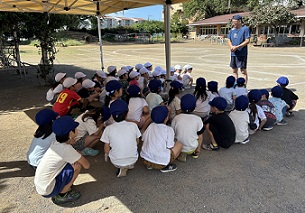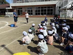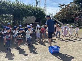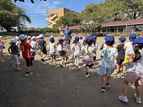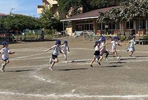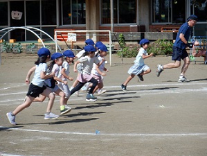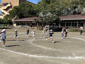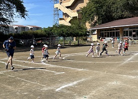 10/8(水)例年、運動会の前に大学の鈴木先生に速く走るコツを教えてもらう、『忍者塾』がありました。始めは、年長さんからです。