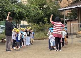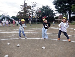 今回は、すみれ組とき組で玉入れをしました。「エイ・エイ・オー」をすると気持ちも盛り上がってきます。