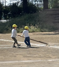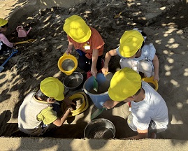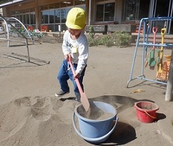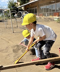 運動会にむけて、園庭を整備しています。あふれている砂を集めて、砂場に戻していると、子ども達が手伝ってくれています。
