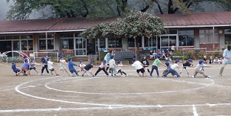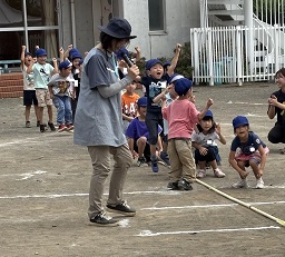 綱を持って、園長先生の笛の合図で始まります。「オーエス!オーエス!」