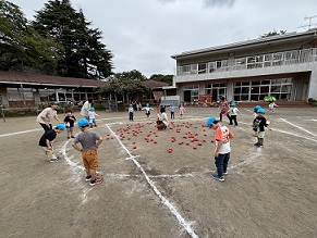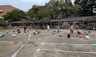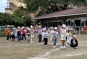 すみれ組は紅チーム、き組は白チームです。音楽に合わせて、チェッコリーを踊ります。