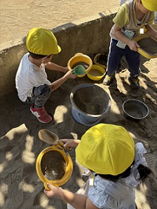 砂場では、ふるいを使って砂をきれいにしてくれています。