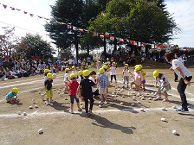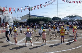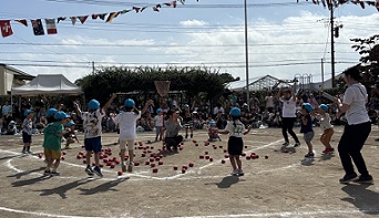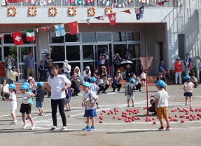 年中さんの玉入れです。入場のうたに合わせて、「エイエイオー」と気合十分でした。