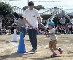 年中さん親子競技は、お家の方と一緒に長い棒を持って、コーンを回っていきます。終わったら次の友達と交代して、クラスみんなに繋ぎました。