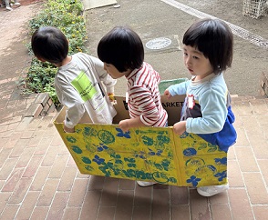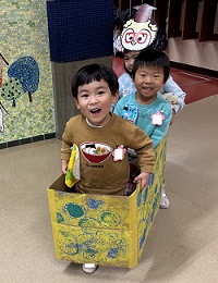 こちらは、親子競技で使った車に友達と乗っています。子ども達には、車ではなく電車のようです。