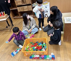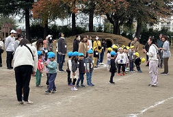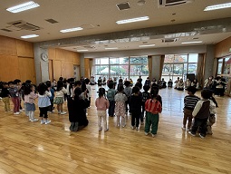 11/13(木)年中組の親子で遊ぶ日が行われました。午前中は、いつものように遊んで、お片付けをした後にお家の方が集まっているホールですみれ組さん、き組さん一緒にお集まりをしました。