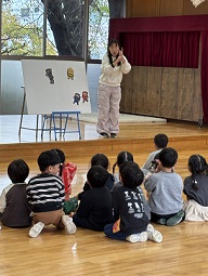 ホールの後ろにいるお家の方に、歌を聞いてもらいました。その後、みんなで忍者のパネルシアターを観ました。先生や友達と一緒に歌を歌ったりしながら、楽しんでみていました。