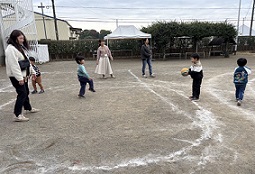 園庭では、「ボール当て」です。外から、中にいる子を当てて、当てたら中に入れます。