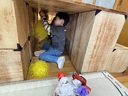 ホールでは、大型積み木を使ってお家づくり。黄色のポンポンは、電気のようです。