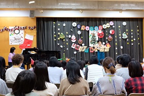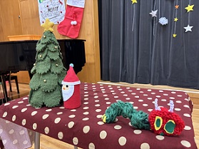 12/1(金)父母会主催のクラシックコンサートが行われました。ホールの入り口にも、「はらぺこあおむし」がいました。