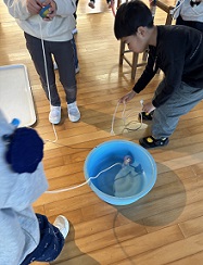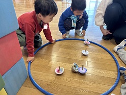 こちらは、年少さんです。手回しこまに色を塗った丸い紙を乗せて回していました。