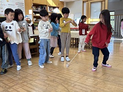 ホールの舞台の上では、去年の年長さんがやっていたように『こまショー』を始めてみたものの、見せることよりも自分たちが一生懸命やっていました。