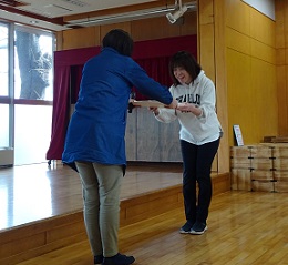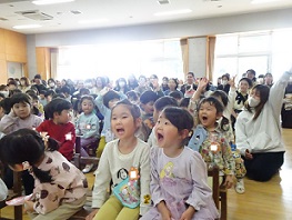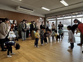 その後、もも組、あか組、すみれ組、き組、みかん組の子ども達と保護者の方々が一緒にホールで3学期の終業式を行いました。